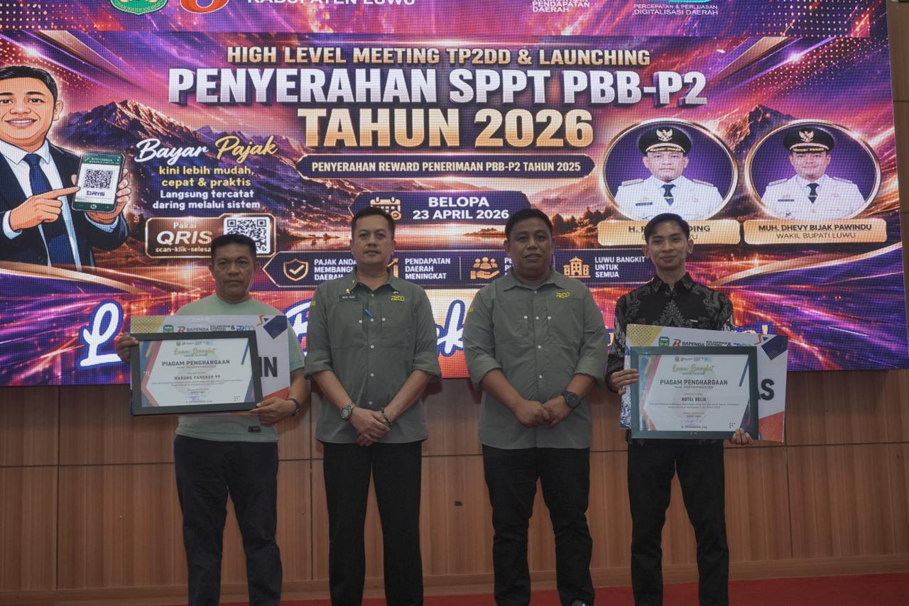 ONLINELUWURAYA.CO, LUWU — Bupati Luwu, Patahuddin menghadiri High Level Meeting Tim Percepatan dan Perluasan Digitalisasi Daerah (TP2DD) yang dirangkaikan dengan launching penyerahan SPPT PBB-P2 Tahun 2026 serta penyerahan reward penerimaan PBB-P2, Kamis (23/4/2026), di Aula Andi Kambo, Kompleks Perkantoran Bupati Luwu.