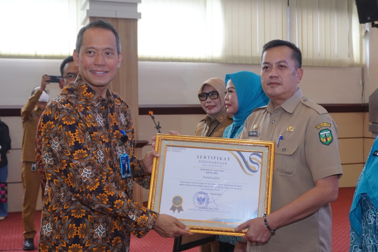 ONLINELUWURAYA.CO, LUWU — Pemerintah Kabupaten Luwu menerima Sertifikat Penghargaan atas dukungan dan komitmen dalam pelaksanaan Program Makan Bergizi Gratis (MBG) bagi Sasaran 3B (Ibu Hamil, Ibu Menyusui, dan Balita Non Paud) dari Wihaji, Menteri Kependudukan dan Pembangunan Keluarga/Kepala BKKBN.