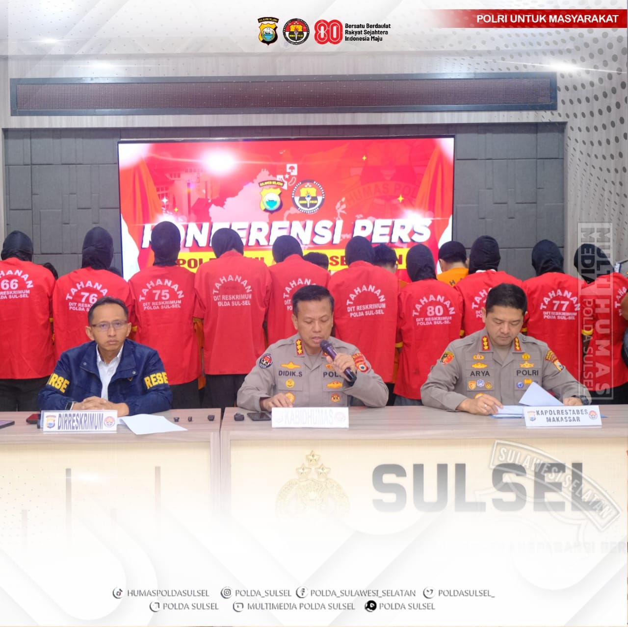 Hal tersebut disampaikan dalam Konferensi Pers Polda Sulsel yang digelar di Lobi Mapolda Sulsel, Kamis (04/09/2025). Konferensi pers dipimpin oleh Dirreskrimum Polda Sulsel Kombes Pol Setiadi Sulaksono, S.I.K., M.H., bersama Kabid Humas Polda Sulsel Kombes Pol Didik Supranoto, S.I.K., M.H., serta Kapolrestabes Makassar Kombes Pol Dr. Arya Perdana, S.H., S.I.K., M.Si.