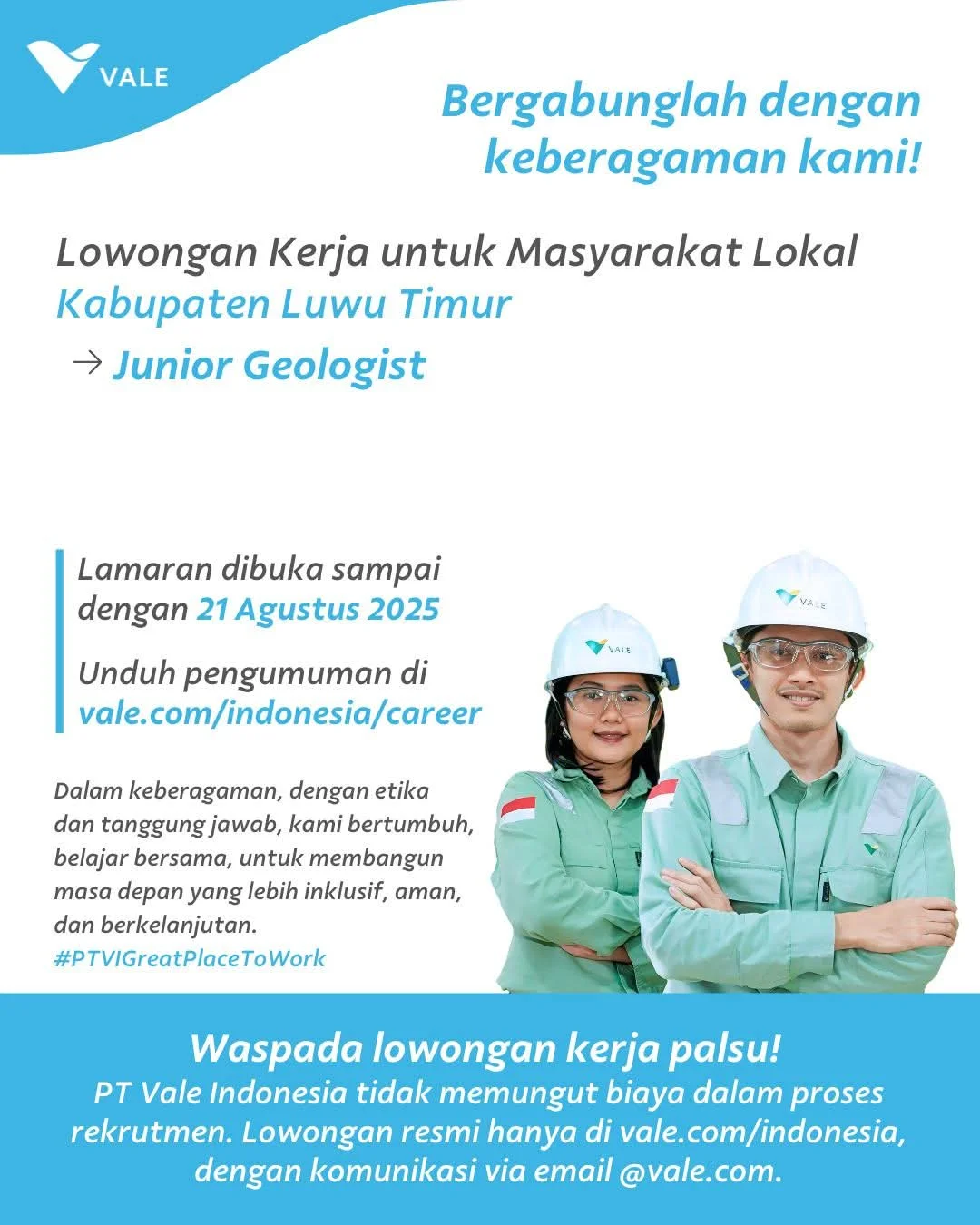 Lowongan kerja PT Vale untuk posisi Junior Geologist, bagi anda yang berminat segera kirimkan lamaran Anda sebelum 21 Agustus 2025.