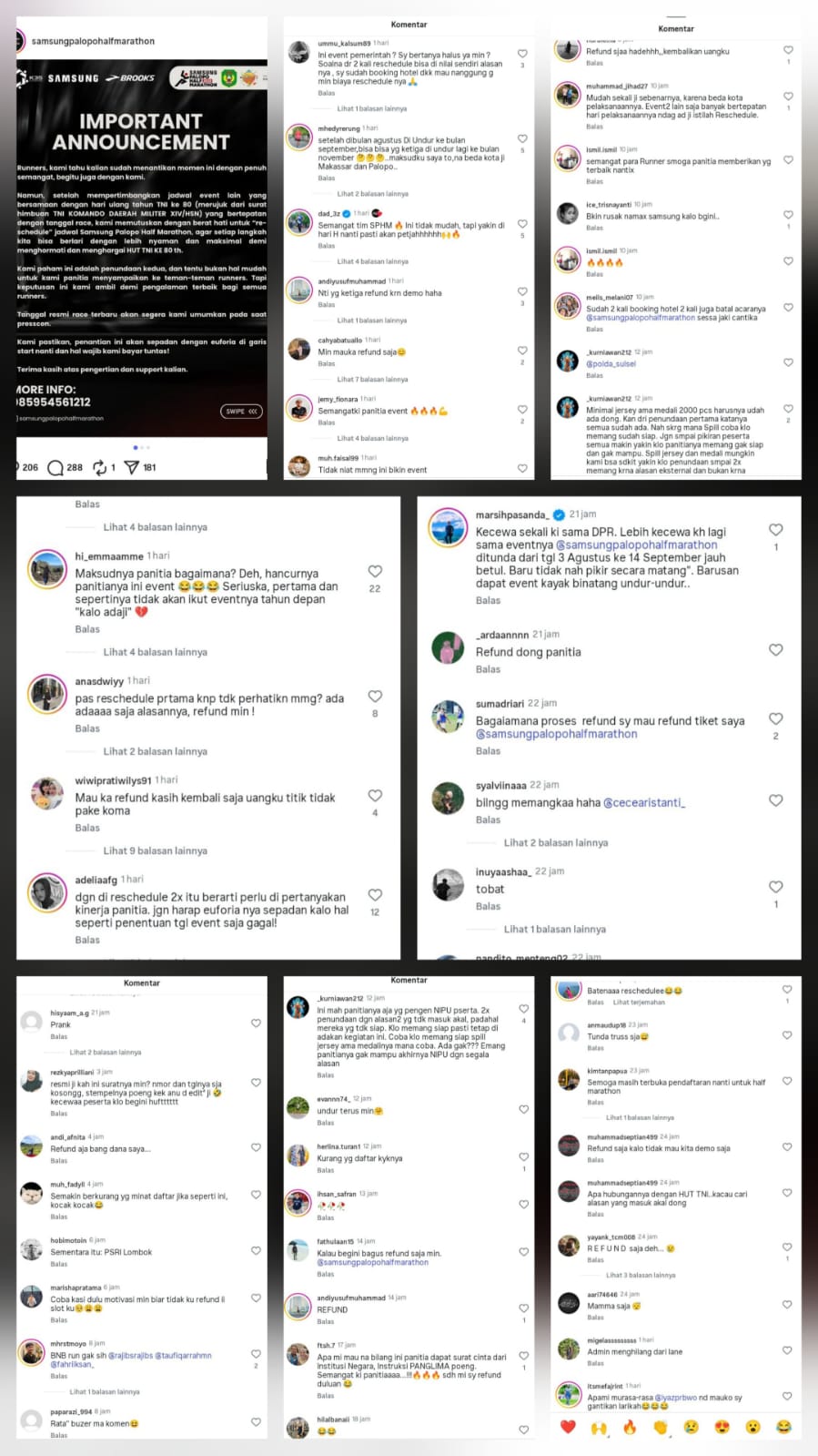 Kolom komentar dibanjiri tuntutan refund, sindiran pedas, hingga tuduhan panitia tidak profesional.